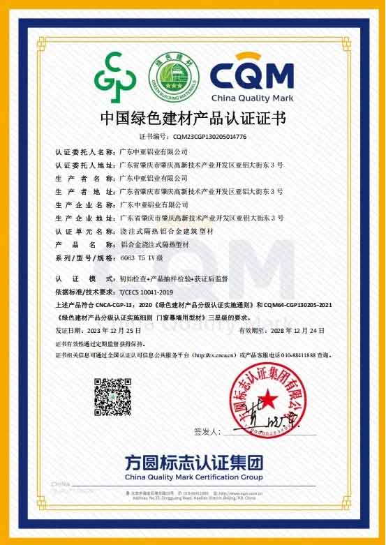 廣東中亞鋁材隔熱型材達(dá)到中國(guó)綠色建材產(chǎn)品三星級(jí)要求